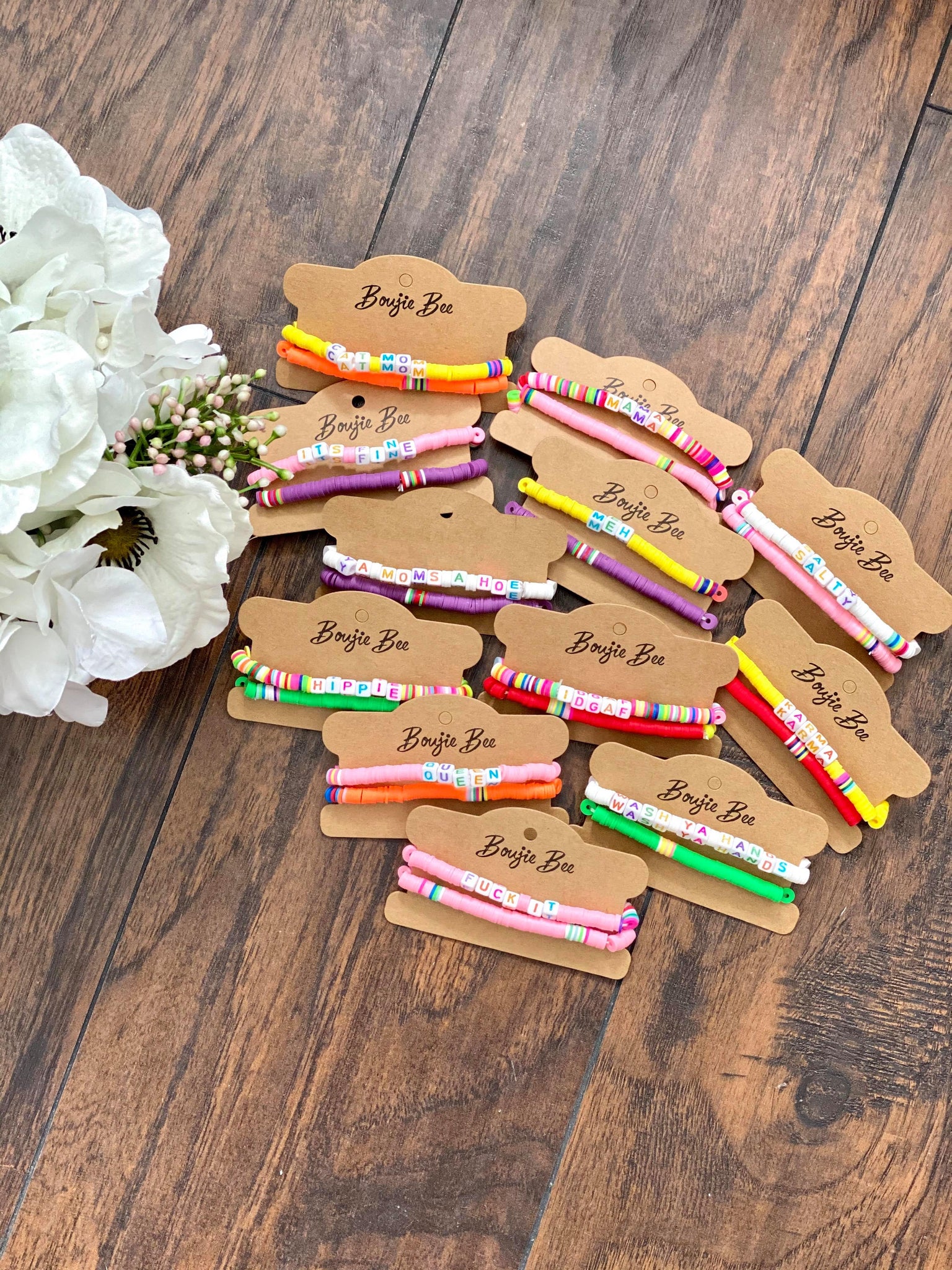 These Boujie Bee Beaded Bracelet Sets are bold yet trendy! The colorful set comes with one solid color band and one band with a saying ,they are sure to make a statement with there bright colors!