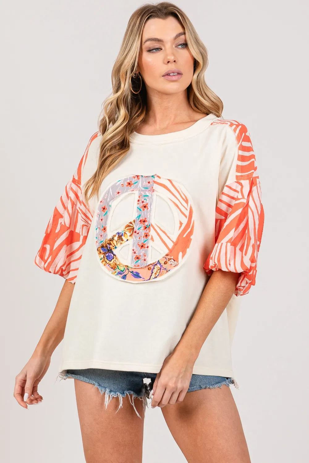 The Peace Applique Patch with Zebra Print Contrast Top features a standout applique peace patch on the front and zebra print contrast sleeves for a bold look. The square patch on the back adds an extra design element. With its relaxed and oversized fit, this top combines comfort with a distinctive, edgy style. Ideal for adding a unique touch to casual outfits.
